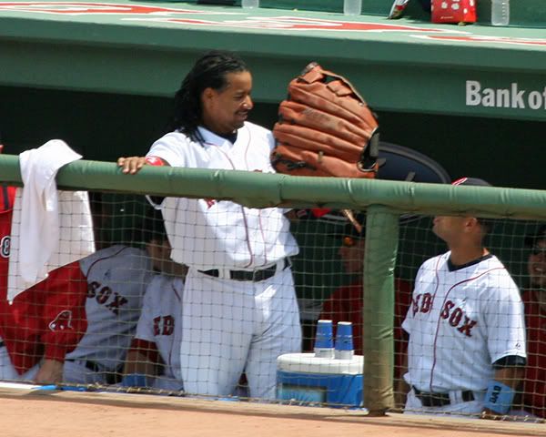 I watched video last night of Youk and Manny being Varitek. They were goofing on Tek and Casey's batting stance. Youk has one of the bounciest and wiggliest batting stances I have seen. So it was really funny to watch him trip on somebody else. Manny too. They mimicked Sean Casey's left leg going up like a stork and Tek's right leg {he was batting lefty} sliding in and out. His bat making circles over his head and the adorable way he takes a deep breath and hopes like hell, he makes contact. I wish they had a dugout cam nestled in the corner of the screen. We miss a lot of really funny stuff, because they always seem to be showing something unrelated to baseball. Or worse, they cut away for some ridiculous interview with a complete nobody. This seems to happen a lot when Jason is at bat. "Let's go to the studio!" Let's not.